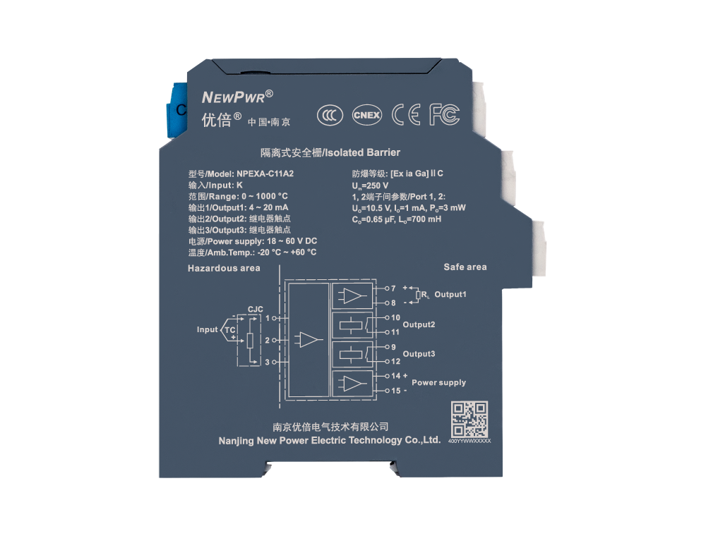 Temperature input isolated barrier, it converts the thermocouple signals from a hazardous area into 4~20mA signals to a safe area by isolation, two relay alarm outputs. It has external cold junction compensation terminals. It needs an independent power supply. The input, output, and power supply are galvanically isolated from each other. The self-test function is also available on this device. Calibrate the apparatus or modify parameters by using a handheld programmer.
