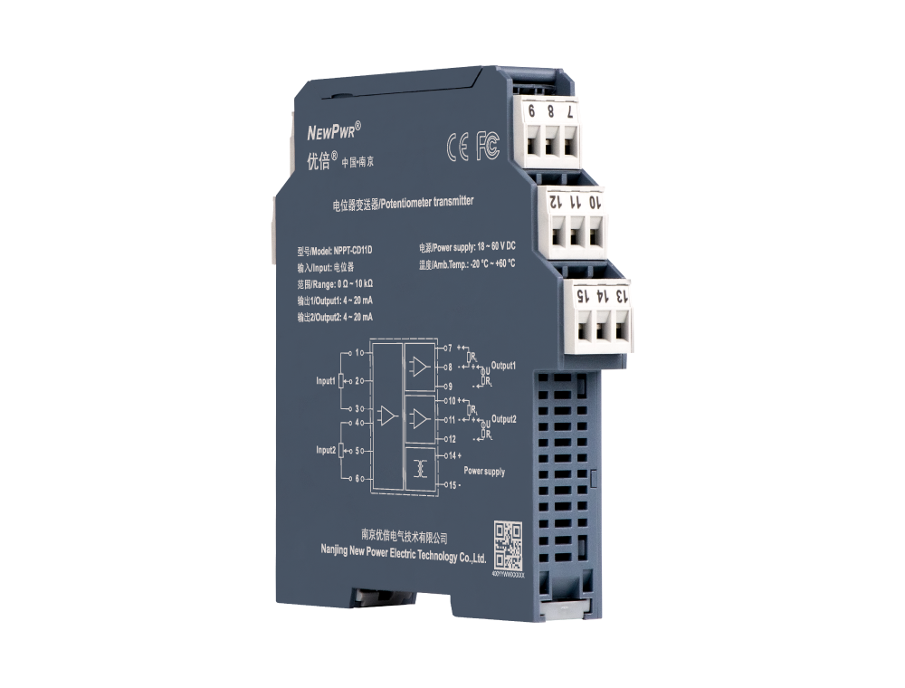 This potentiometer transmitter converts the 3-wire potentiometer signals to 4~20mA signals. It needs an independent power supply. The input, output, and power supply are galvanically isolated from each other. Calibrate the apparatus or modify parameters by using a handheld programmer.