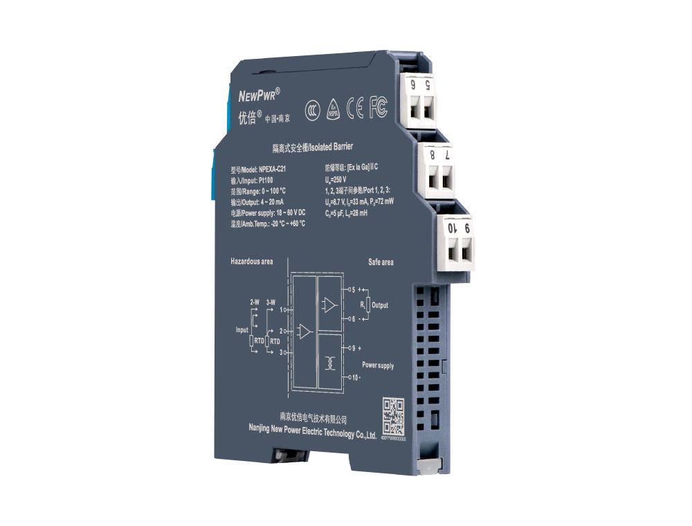 Temperature input isolated barrier, it converts the thermal resistance signals from a hazardous area into 4~20mA signals to a safe area by isolation. It needs an independent power supply. The input, output, and power supply are galvanically isolated from each other. The self-test function is also available on this device. Calibrate the apparatus or modify parameters by using a handheld programmer.