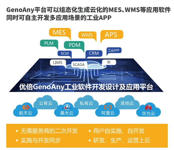 優(yōu)倍基于工業(yè)互聯(lián)網(wǎng)的GenoAny工業(yè)云平臺(tái),該平臺(tái)以豐富SaaS層工業(yè)APP為目標(biāo),采用可視化、低代碼開(kāi)發(fā)技術(shù)提供開(kāi)發(fā)者快速構(gòu)建基于微服務(wù)的MES、PDM、WMS、SCM等多種應(yīng)用軟件,構(gòu)建工業(yè)APP的創(chuàng)新生態(tài)圈,信息化業(yè)務(wù)范圍延伸到工業(yè)互聯(lián)網(wǎng)及云服務(wù)。