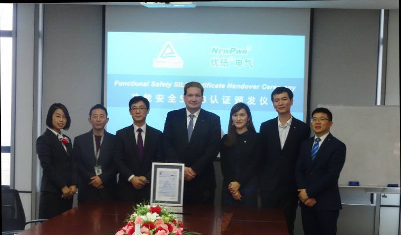 期間舉行了頒證儀式,陶思騰(Thorsten Keiter)先生代表德國萊茵TUV,向優倍電氣頒發了功能安全(SIL)認證證書。