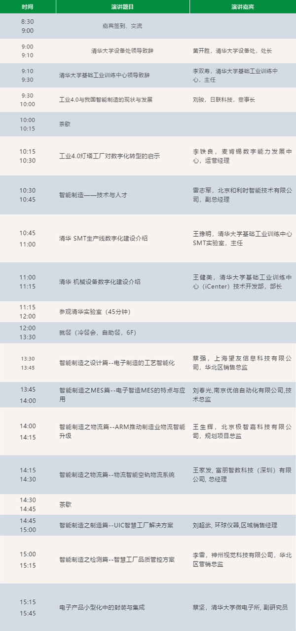 據介紹,此次研討會旨在打造中國電子制造行業中工業智能及整體自動化解決方案的高端論壇。搭建交流共享平臺,促進專業技術交流。本研討會特邀清華教授及行業專家就相關智能制造主題做精彩演講。同時開放清華大學基礎工業訓練中心數字化工廠及SMT實驗室,分享清華在智能制造方面的成果。
