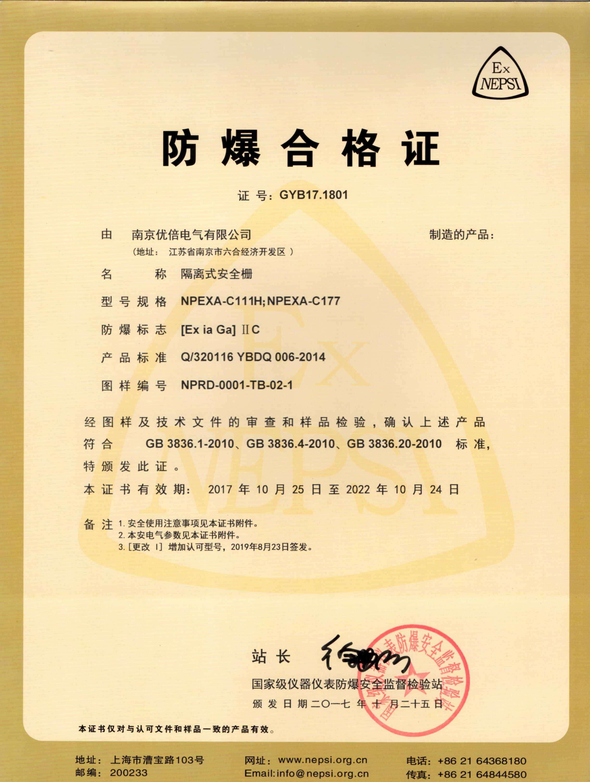 | 應用場所 | 安裝于安全區,可連接0區、1區、2區;ⅡA、ⅡB、ⅡC;T4 ~ T6危險區的本安設備 |