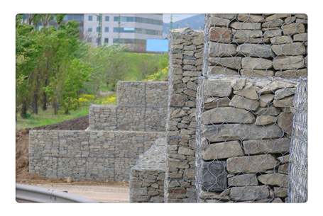 石籠網是由高抗腐蝕、高強度、具有延展性的低碳鋼絲或者包覆PVC的以上鋼絲使用機械編織而成,根據ASTM A 975和EN10223標準,所使用的低碳鋼絲直徑根據工程設計要求而不同。一般介于2.0-4.0mm之間,鋼絲的抗拉強度不少于38kg/m2,金屬鍍層重量一般高于245g/m2石籠網片的邊緣線直徑一般要大于網線直徑。其雙線絞合部分的長度不得小于50mm.以保證絞合部分鋼絲的金屬鍍層和PVC鍍層不受破壞。